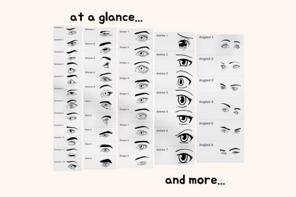 You'll get 50 Procreate Eyes Stamps: 5 Eyes for Women 5 Eyes for Men, 9 Shapes of Eyes, 18 Eyes of Emotions, 7 Anime Eyes and 6 Pairs of Eyes at an Angle